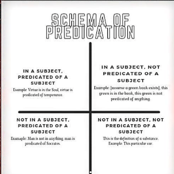 We shall take a brief detour in order to properly examine what it means to state something is in a subject, and to explain what it means to be predicated of a subject. First, we should explain what we mean by subject and predicate. The subject of a statement is what the subject is about. The predicate is what a statement says about the subject. For something to be in something, we mean it has no separate essence removed from the subject. For instance, if we had a green book, the particular greenness would be in the book, although it is not predicated of anything. As stated earlier, a lowest species encompasses multiple subjects. These subjects are particular substances. The species, therefore, is a predicate of the individual subjects.
